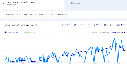 Google Trends also shows an upward trend in the last five years of US searches for “how to work well with a team”, with 1k searches in the past month.
